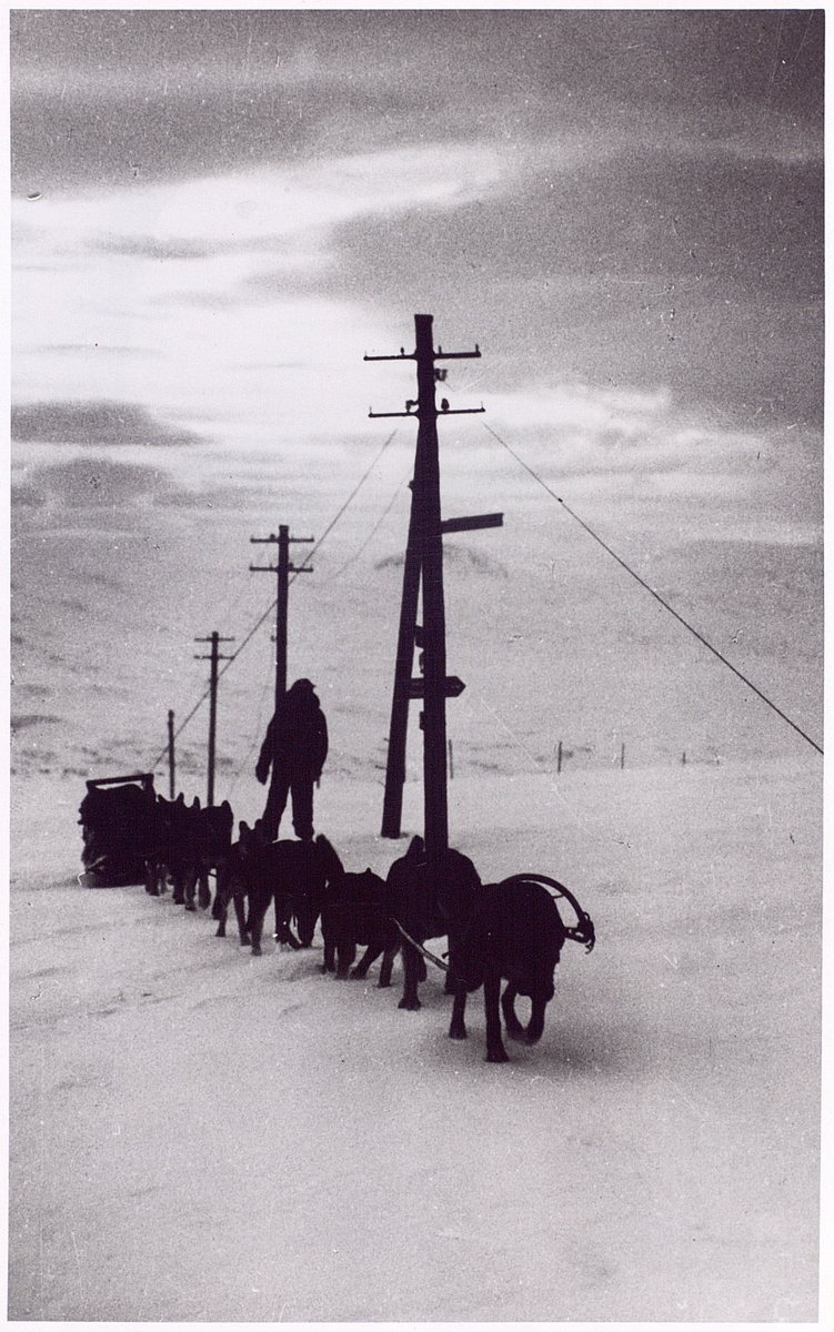 Reparationspatrull vid en stolplinje i Jamtlandsfjällen 1952.