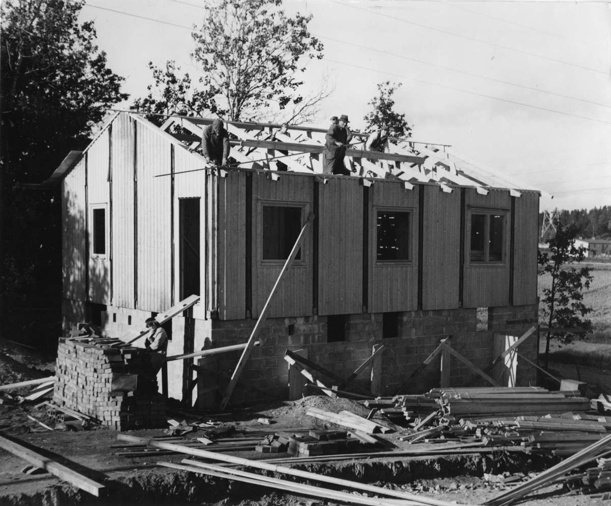 Monteringsfärdigt trähus under uppbyggnad.