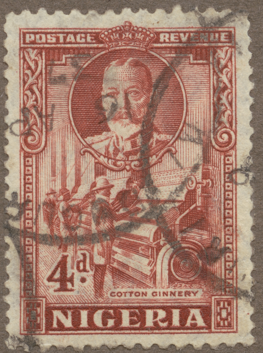Frimärke från Nigeria, 1936. Motiv av bomullsrensningsmaskin för bortrensande av frön ur bomull. Ovan, Kung George V.