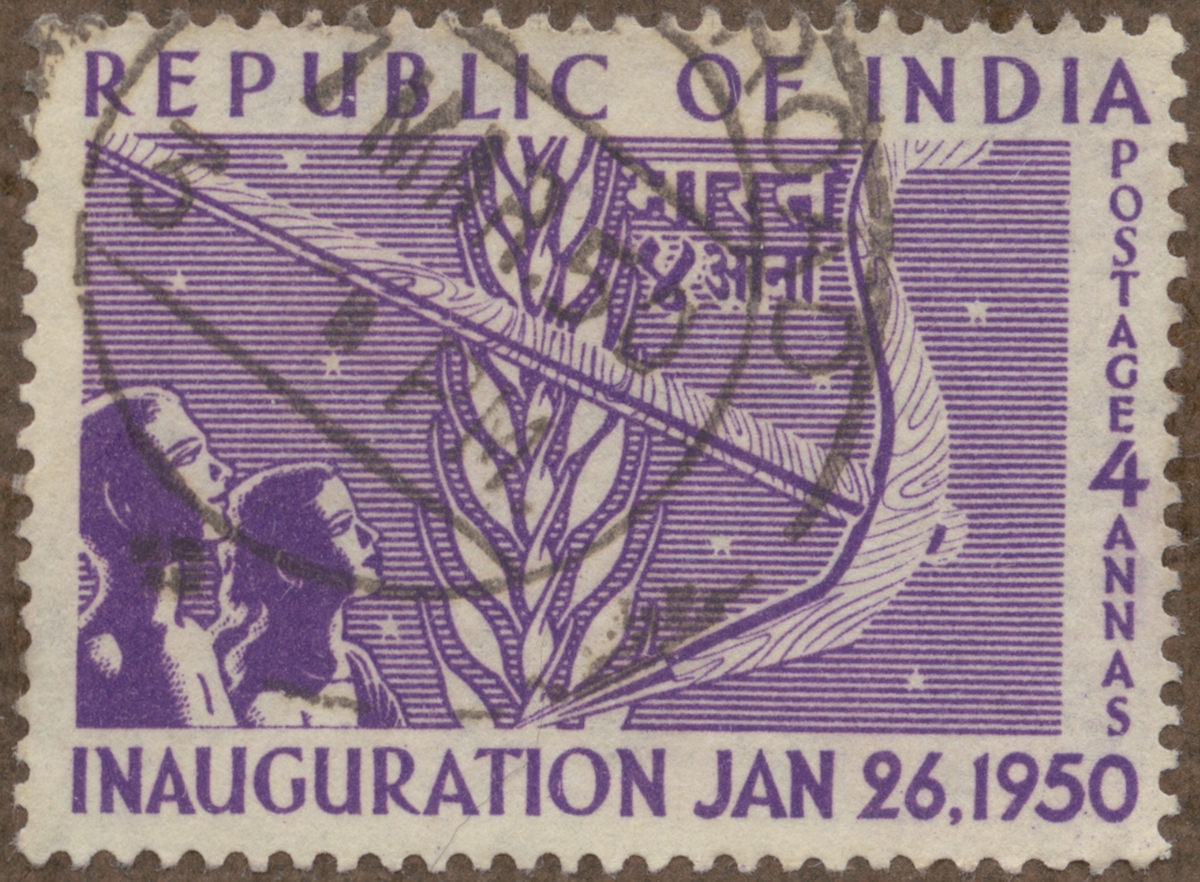 Frimärke från Indien, 1950. Motiv av Primitiv indisk träplog. Sädesax. -Invigning av Republiken 26 januari 1950