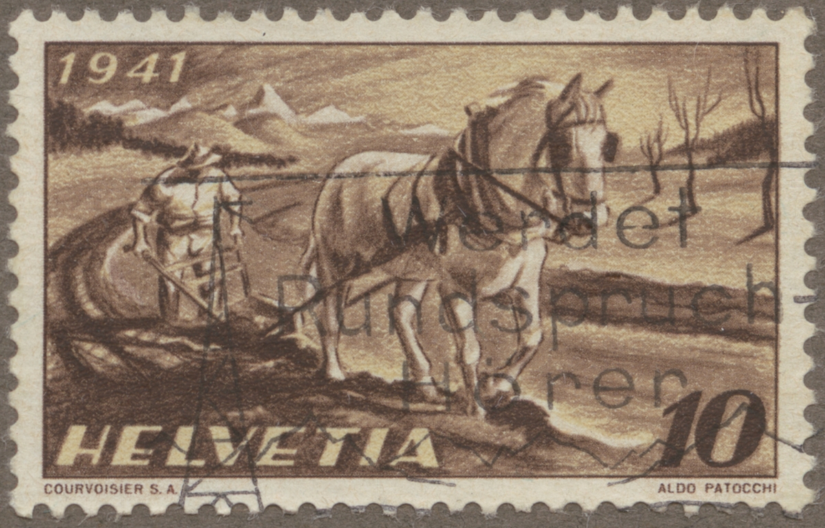 Frimärke från Schweiz, 1941. Motiv av Schweizisk lantbruksarbetare. Plöjning.