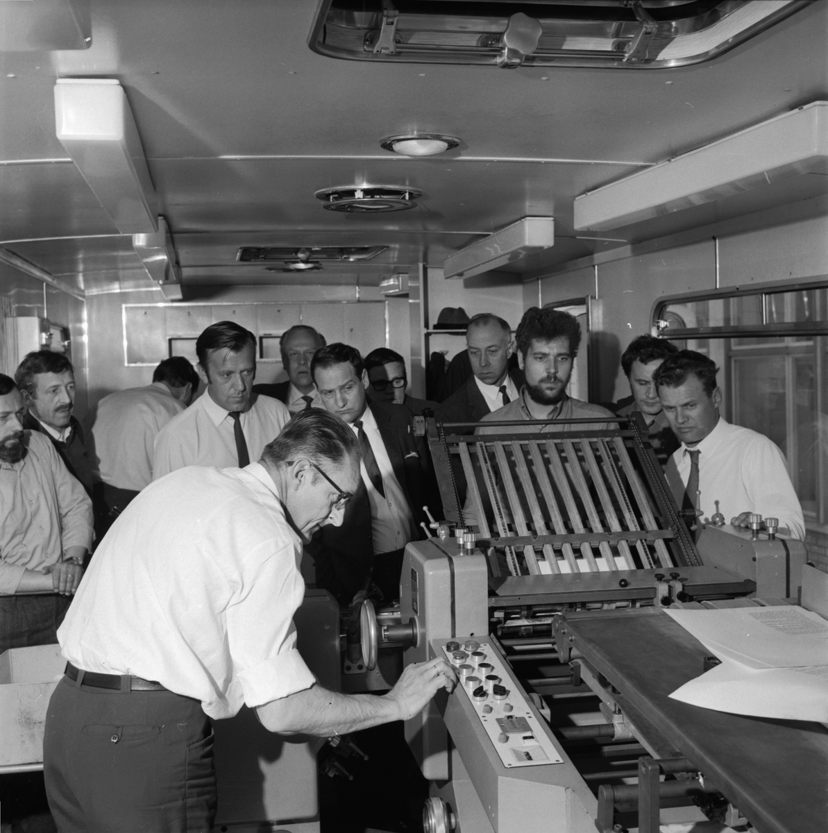 Personer vid tryckpress. >>