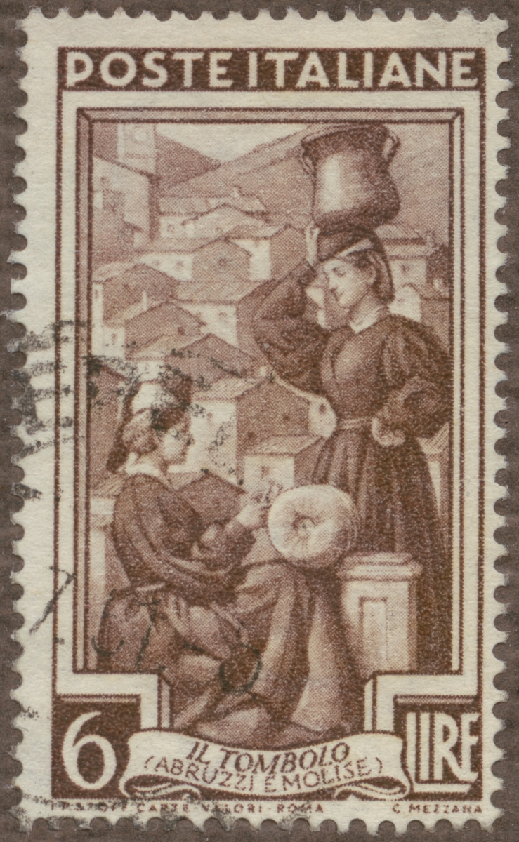 Frimärke från Italien, 1950. Motiv av knypplerska. Abruzzerna, Italien.