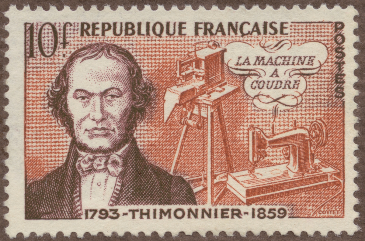 Frimärke från Frankrike, 1955. Motiv av fransmannen Barthélemy Thimonnier - 1793-1859. "1830 patent på en kedjestygns symaskin. Mötte stort motstånd från skräddare i Frankrike".