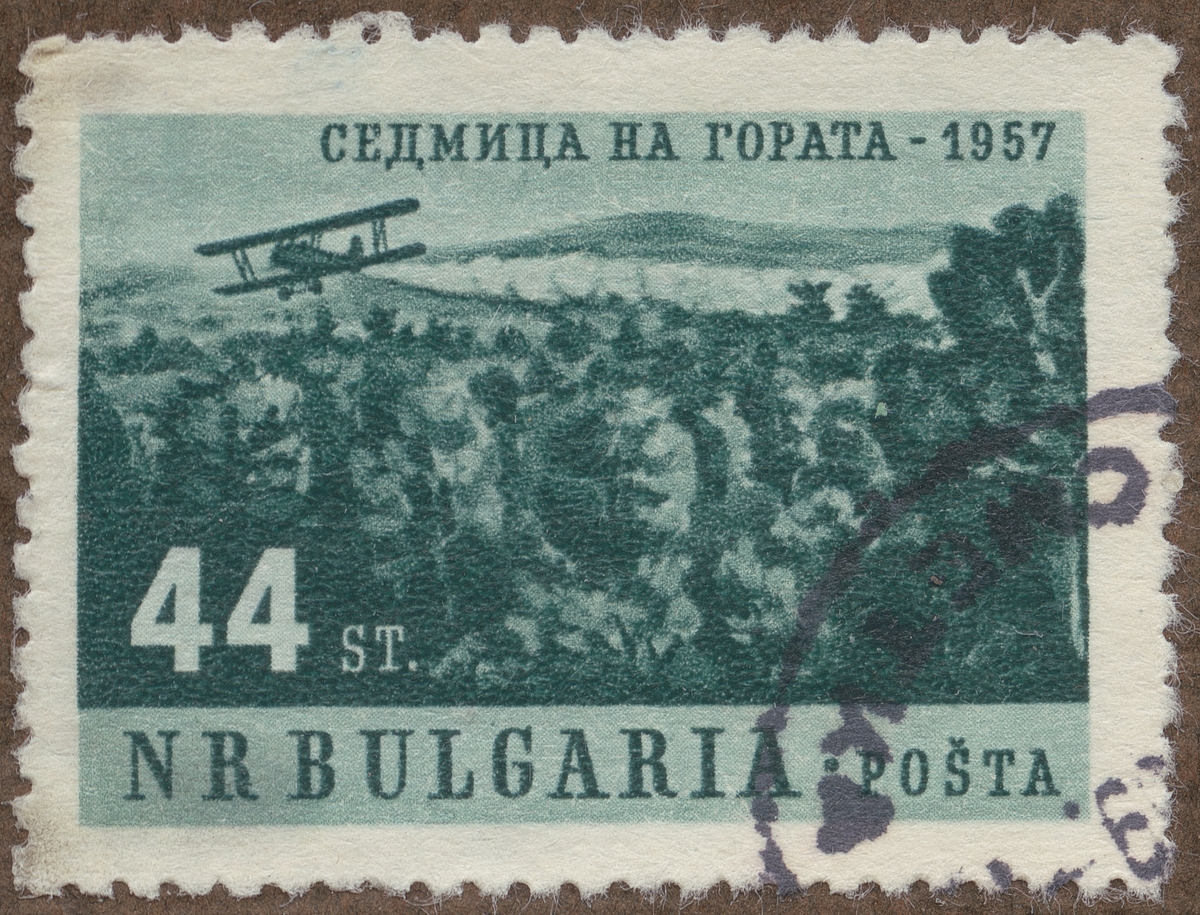 Frimärke från Bulgarien, 1957. Motiv av Biplan över skogslandskap "Momin-Prochod Hotel- " "Turist Hotel serie."