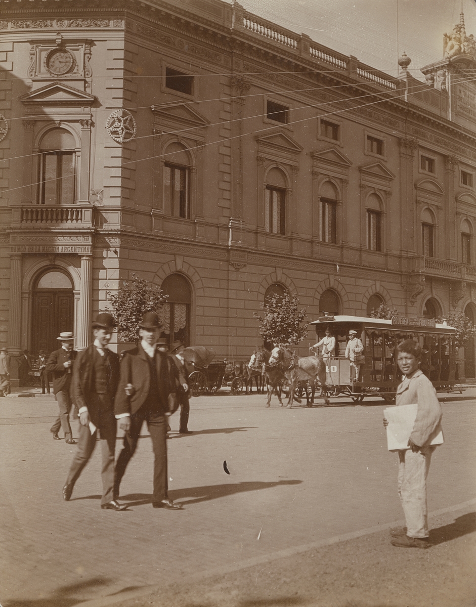 Fotografi från första svenska Antarktisexpeditionen 1901-1904. Motiv av ett antal människor och hästdragen spårvagn på en stor gata i en stad.