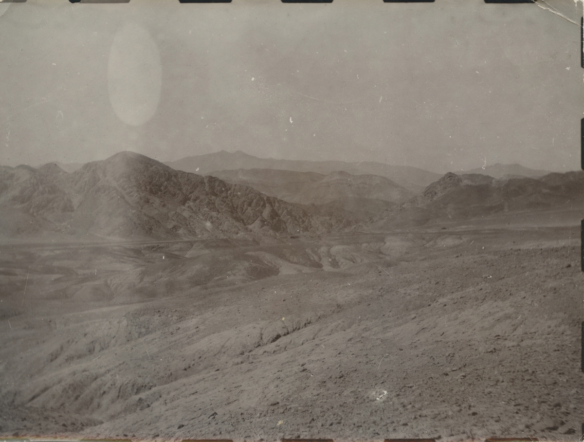 Fotografi från expedition till Peru 1920. Vy över vidsträckt öken/bergslandskap nära de underjordiska akvedukter i södra Peru som kallas Puquios.