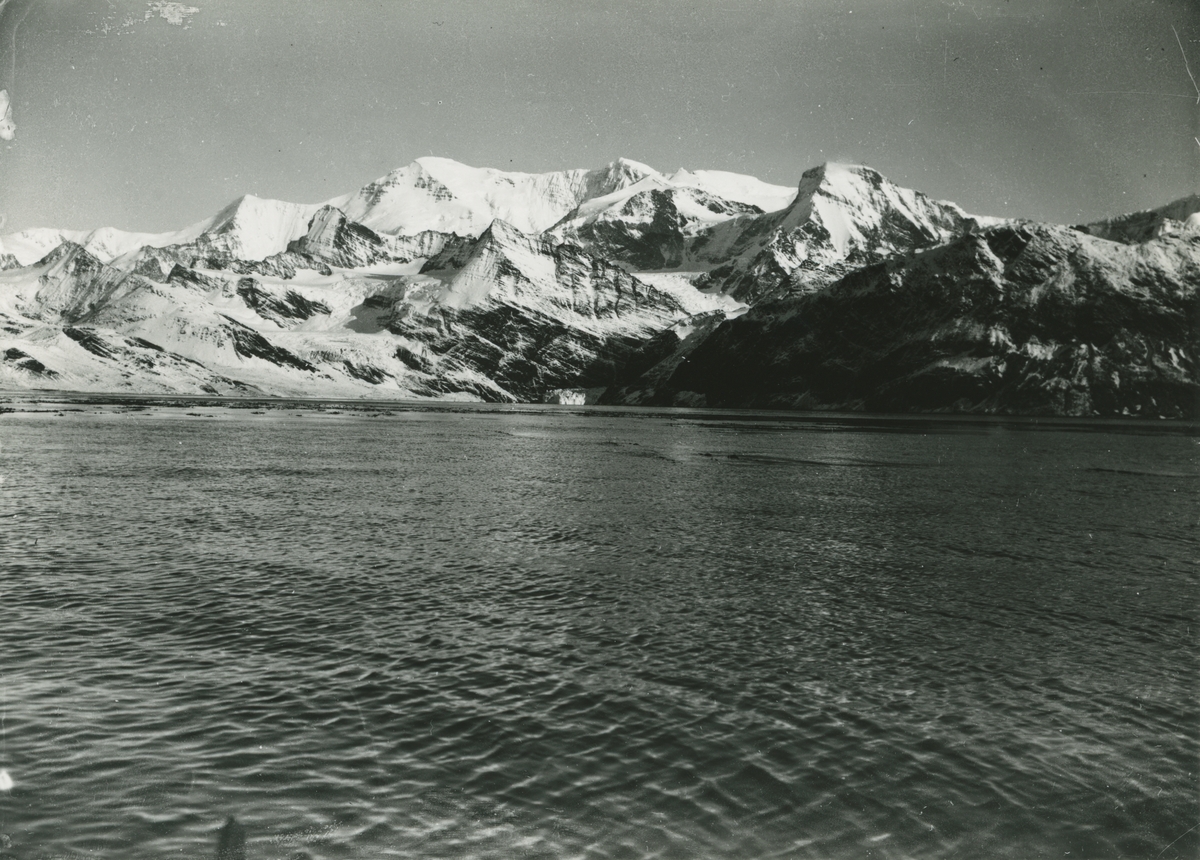 Bild från expedition i Antarktisområdet. Vy över hav och snötäckt berg.
