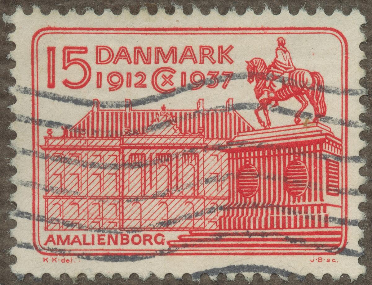 Frimärke från Danmark, 1937. Motiv av Amalienborg Slott i Köpenhamn -Minne av Kung Christian X:s 25-års regeringsjubileum: 1912-1937.