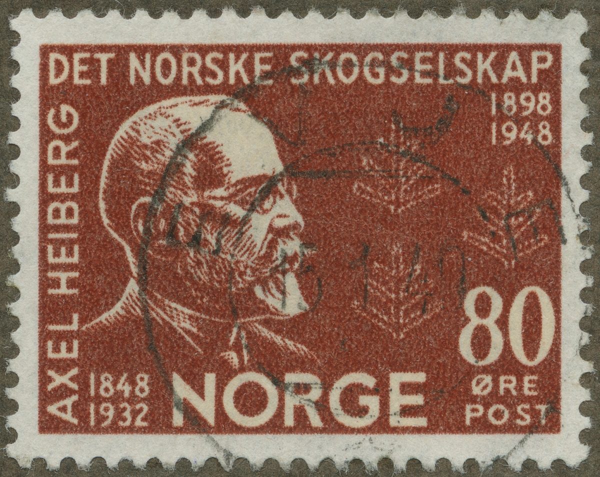 Frimärke från Norge, 1948. Motiv av Axel Heiberg, 1848-1932. Norsk affärsman. Mecenat. Polarfärdsdonator; Nansen och Sverdrup expeditionerna. Initiativtagare 1898 till "Det Norske Skogselskap" 100-årsminne av hans födelse. 1848-1948 samt 50-årsminne av Det Norske Skogselskaps grundande: 1898-1948.