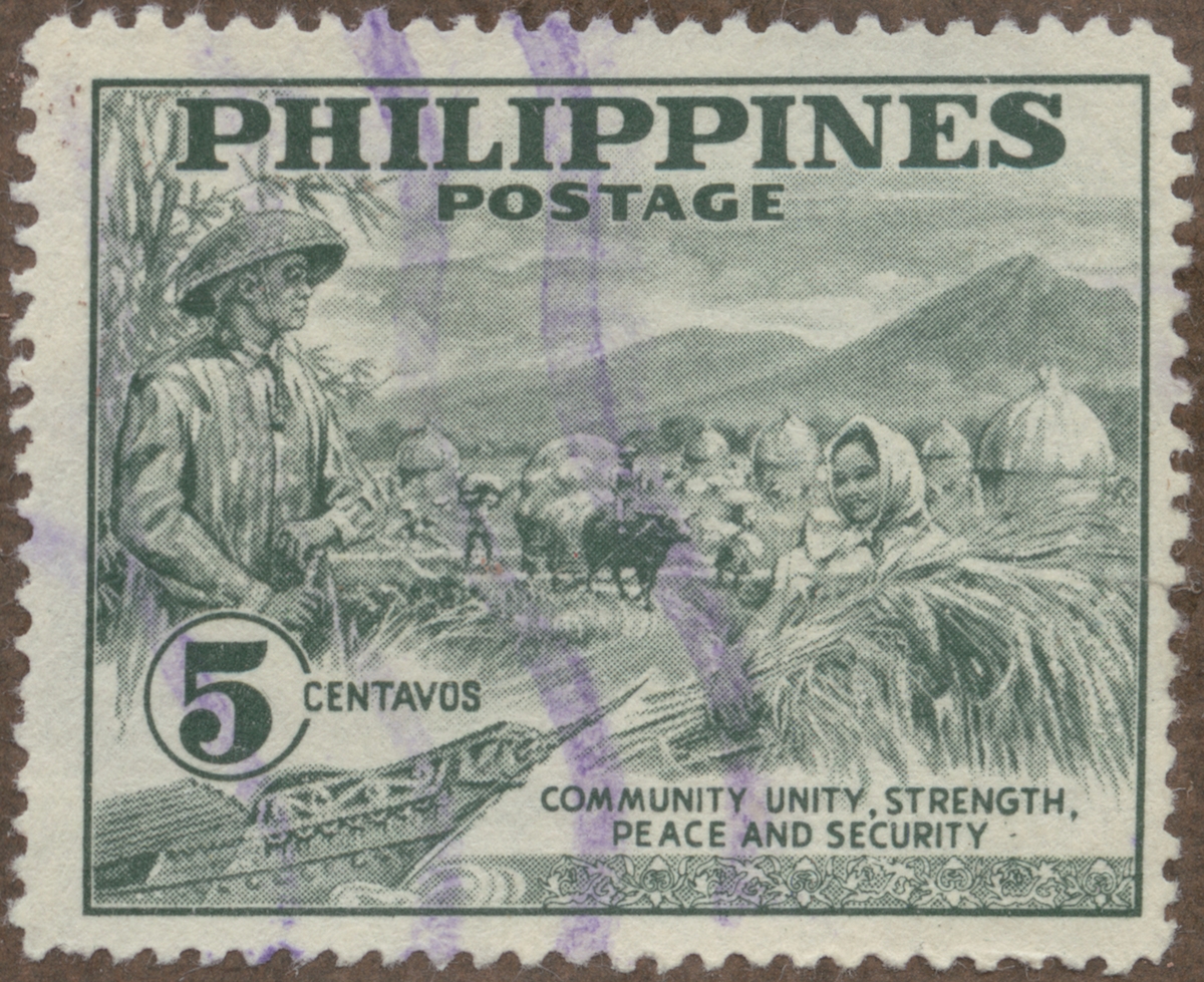Frimärke från Filippinerna, 1951. Motiv av Skördearbete på Filippinerna (t.v.): Barangay hövding inspicerar arbetet.