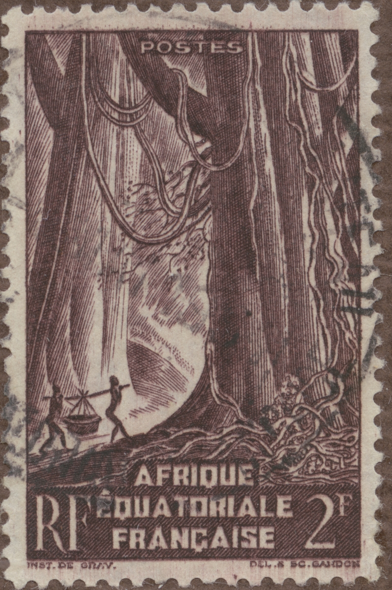 Frimärke från Franska Ekvatorialafrika, 1947. Motiv av arbete i Gabon, urskogen.