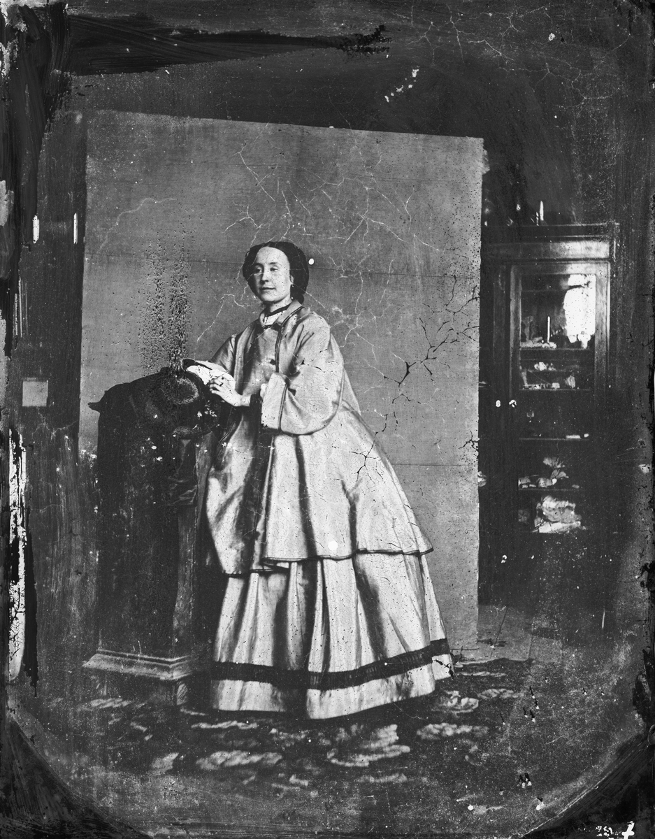 Kvinna lutad mot podium. Troligen från 1850-talet.