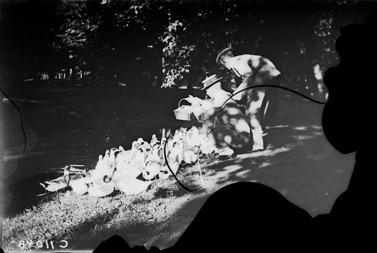 Drottning Victorias bilder. Två män matar änder.