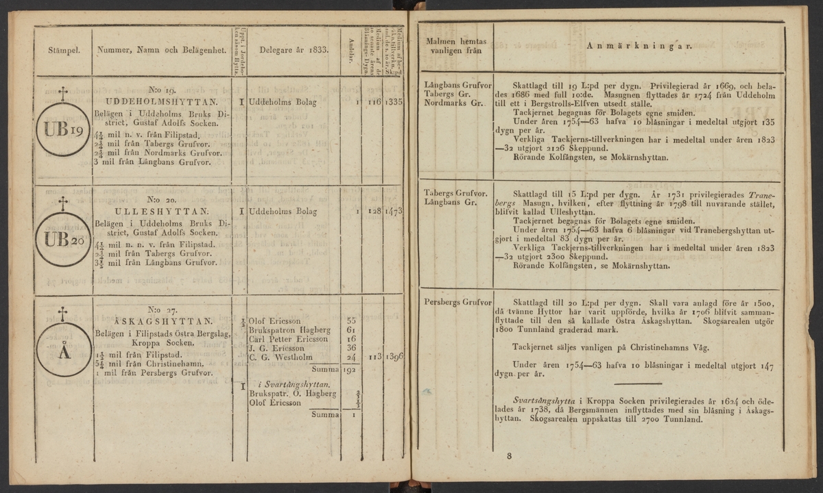Stämpelbok över hytterna inom Värmlands bergmästaredöme, upprättad år 1833.