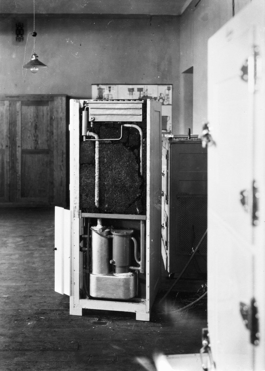 Beteckning: K8. Kylaggregat med isolering i kylskåp fotograget från sidan.