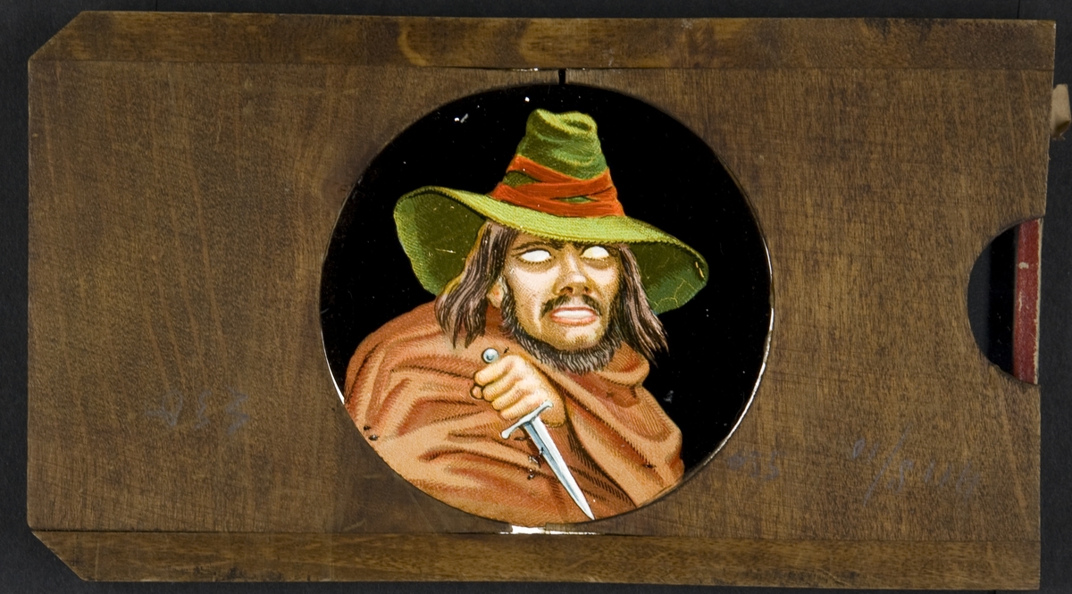 Laterna magica bild målad i färg på glasskiva.
