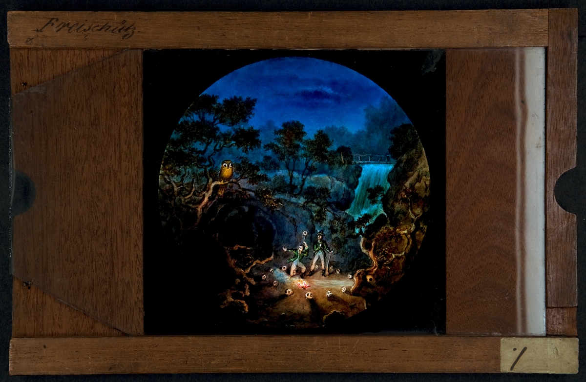 Laterna magica bild målad i färg på glasskiva. "Friskÿtten". No 1". Två män invid vattenfall vid tänd eld omringad av kranier, en uv sitter på trädet bredvid.