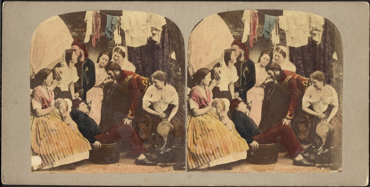 Stereobild, komisk scen. En samling människor vid tvätt och tvättbalja. Kolorerad.