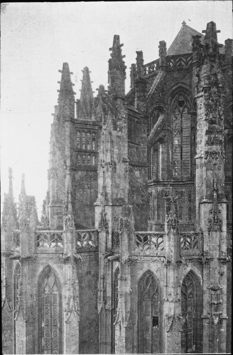 Bilden har förvarats i kartong märkt: Resan1908 XIV. St. Michel 7. Dinan 1.. Text på bild: "Abbaye du Mont St. Michel, Eglise abbatial. Partie du XV: Siècle".