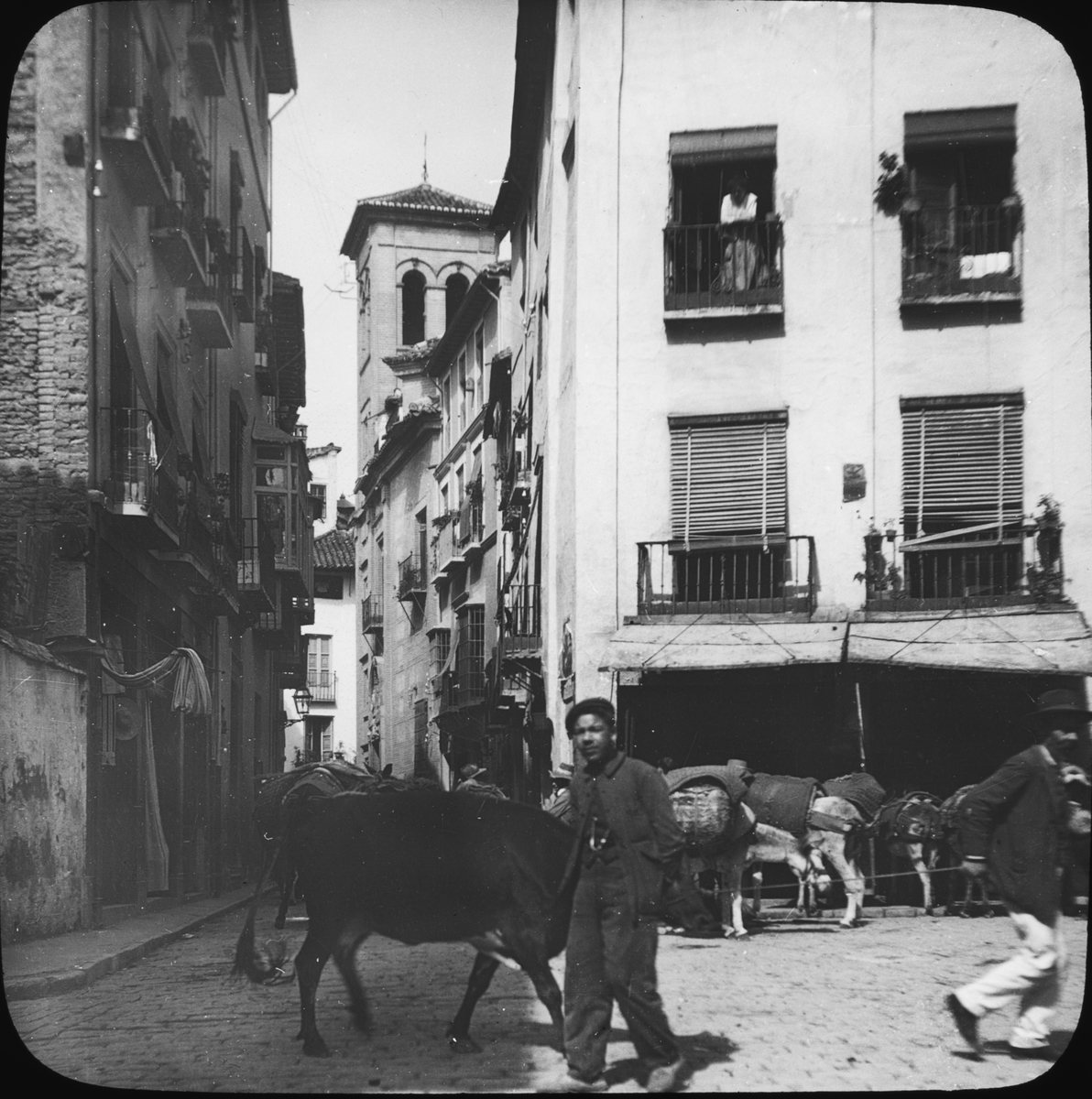 Skioptikonbild med motiv av ung man med kor och åsnor på Calla de Elvira, Granada.