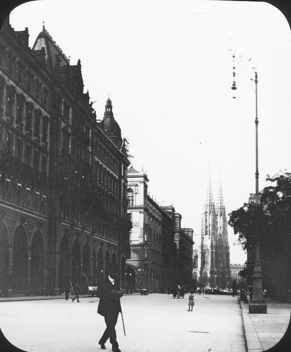 Skioptikonbild med motiv från Wien. Fotografiet taget vid rådhuset Wiener Rathaus men vy över katedralen Votivkirche.