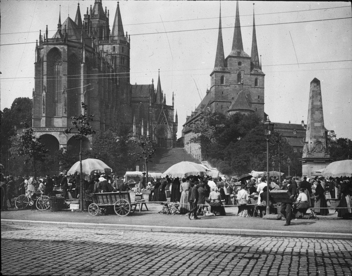 Skioptikonbild med motiv av vy från Erfurt. Torget framför Domen och Severi Kirche med kyrkan och katedralen i bakgrunden.