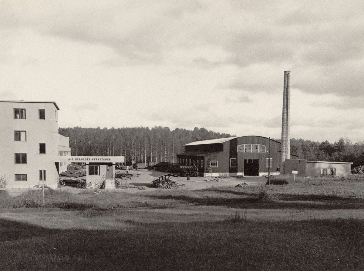 AB Berglöfs Varkstäders nybyggda fabrikskomplex till höger och den gamla verkstadshallen till vänster, 1944.