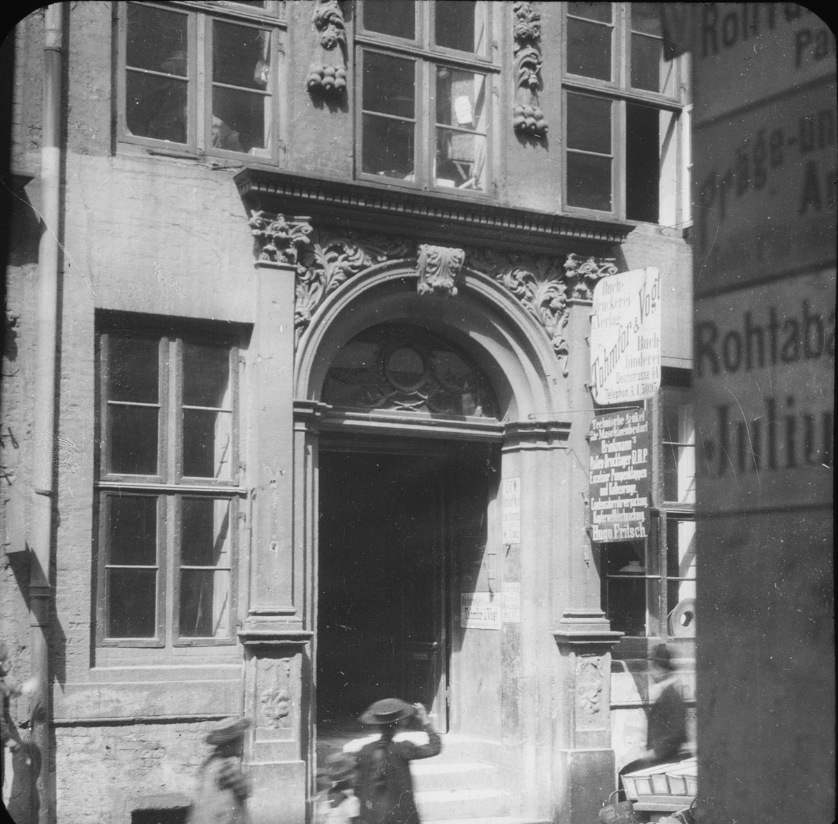 Skioptikonbild med motiv från Sigurd Curmans resor i Europa. Okänd stad.