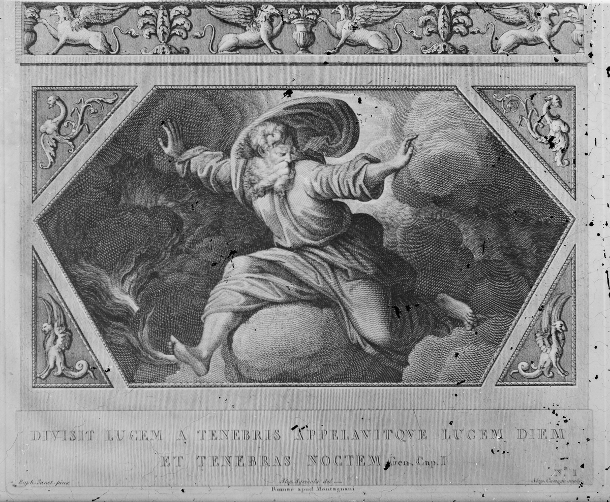 Skioptikonbild. Tryck med motiv av kristendomens och judendomens skapelseberättelse. Bilden visar dag 1 av skapelseberättelsen då Gud skiljer ljuset från mörkret, och Gud kallar ljuset för "dag" och mörkret för "natt".