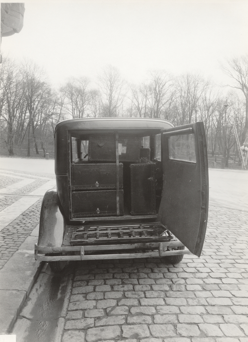 6-cylindrig Volvo personbil ordnad som resandevagn vid Kontoristföreningens hus på Bastionsplatsen i Göteborg. Tillverkad vid Volvos fabrik i Göteborg.