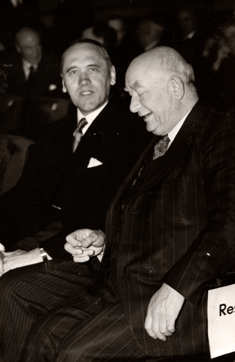 Stadsminister Albin Hanson i samspråk med industriförbundets ordförande, direktör Wehtje vid Sveriges Industriförbunds årsmöte på konserthuset den 25 april 1944.