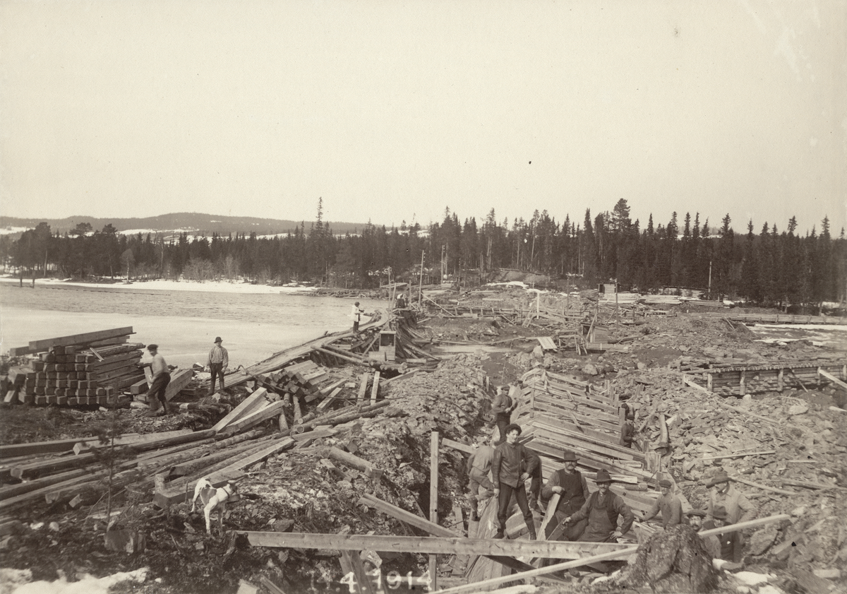 Arbetare vid Äggfors Träsliperifabrik för mekanisk pappersmasseframställning vid Indalsälven i Äggfors, Mörsil.