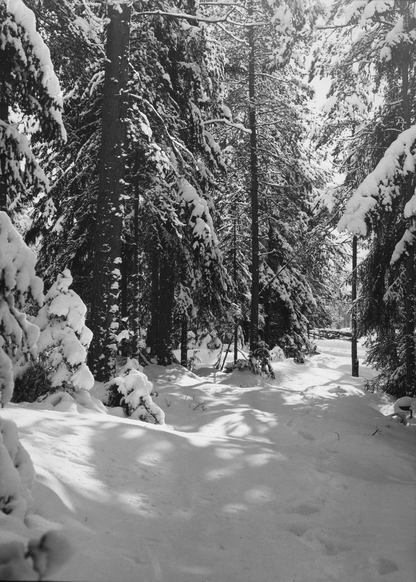 Fönsterbild med motiv av vinterlandskap. Troligen i Hedemoratrakten.