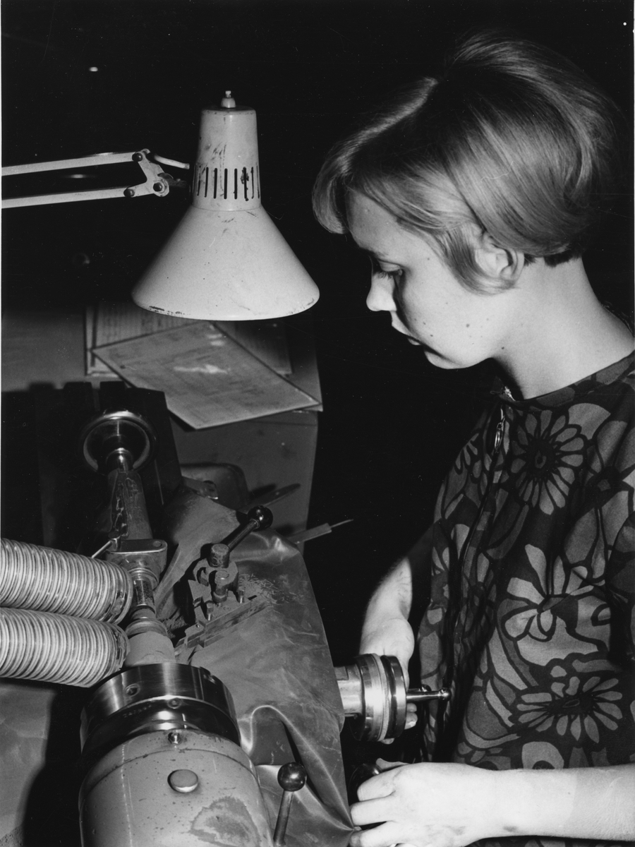 Fagersta Bruks AB. Pressade formstycken före sintringen då de är lätta att bearbeta. Fru Sirkka Nissfolk sköter en svarv där specialprodukter tillformas.