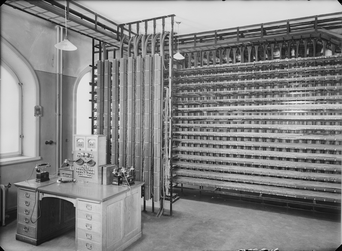 Östermalms rikstelefonstation Karlaplan 2, Stockholm. Korskopplingens linjesida. Korskopplingsstativ och mätbord.