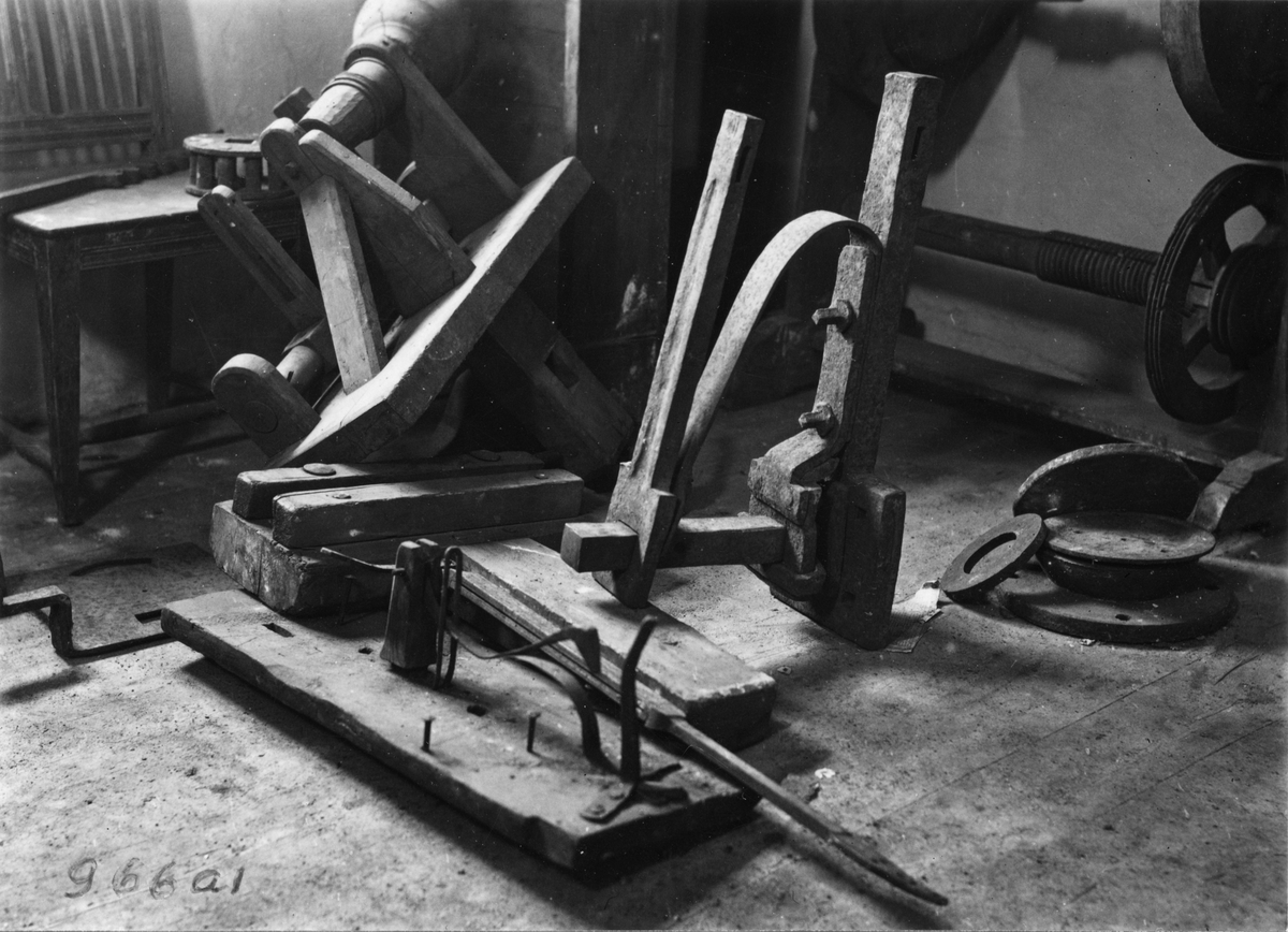 Polhemsstugan i Herrgårdsparken, flyttad från brukssamhället på 1860-talet för att tjäna som kolerasjukhus. I byggnaden var en tid Polhemsföremålen inrymda. Föremålen som de hittades i november 1931. En stansapparat, del till tråddragningsapparat, hammarverk samt gängapparat och överstansar till blecktallrikar.
