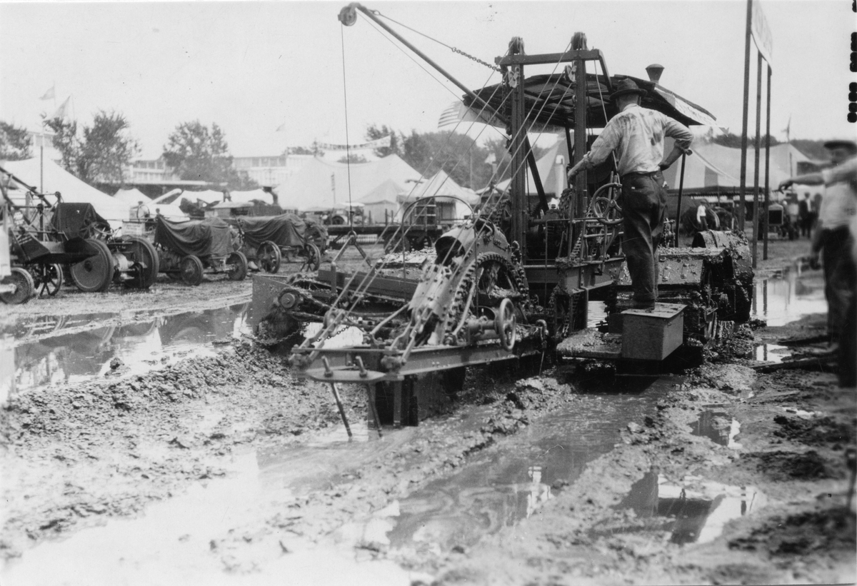 Täckdiskesgrävmakinen "Buckeye" vid Lantbruksutställningen i Des Momes i augusti 1922. Maskinen gick obehindrat fram i genomblöt mark.
