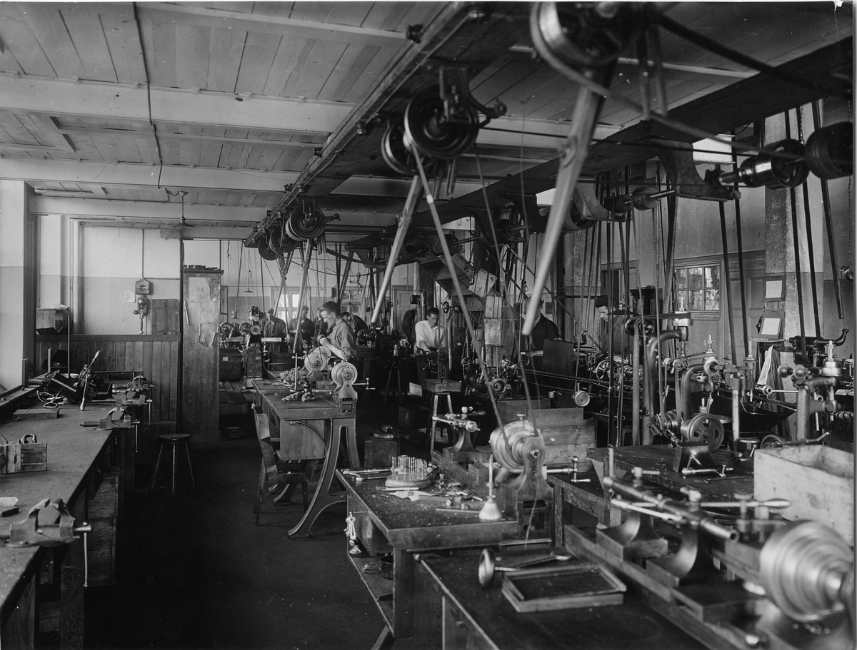 Interiör från fabriken AB Stockholms Glödlampfabrik, 1923. Holophane-belysning.