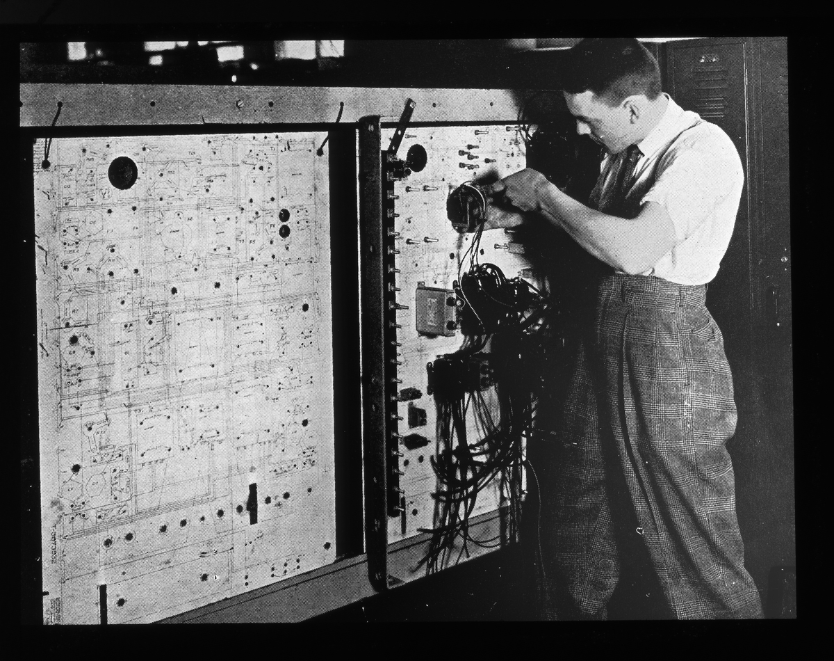 Motståndssvettsade kontrollpaneler blir monterade med användning av kretsschemat klistrat direkt på kontrollpanelens baksida vid kontrollavdelning hos General Electric Company's Schenectady.