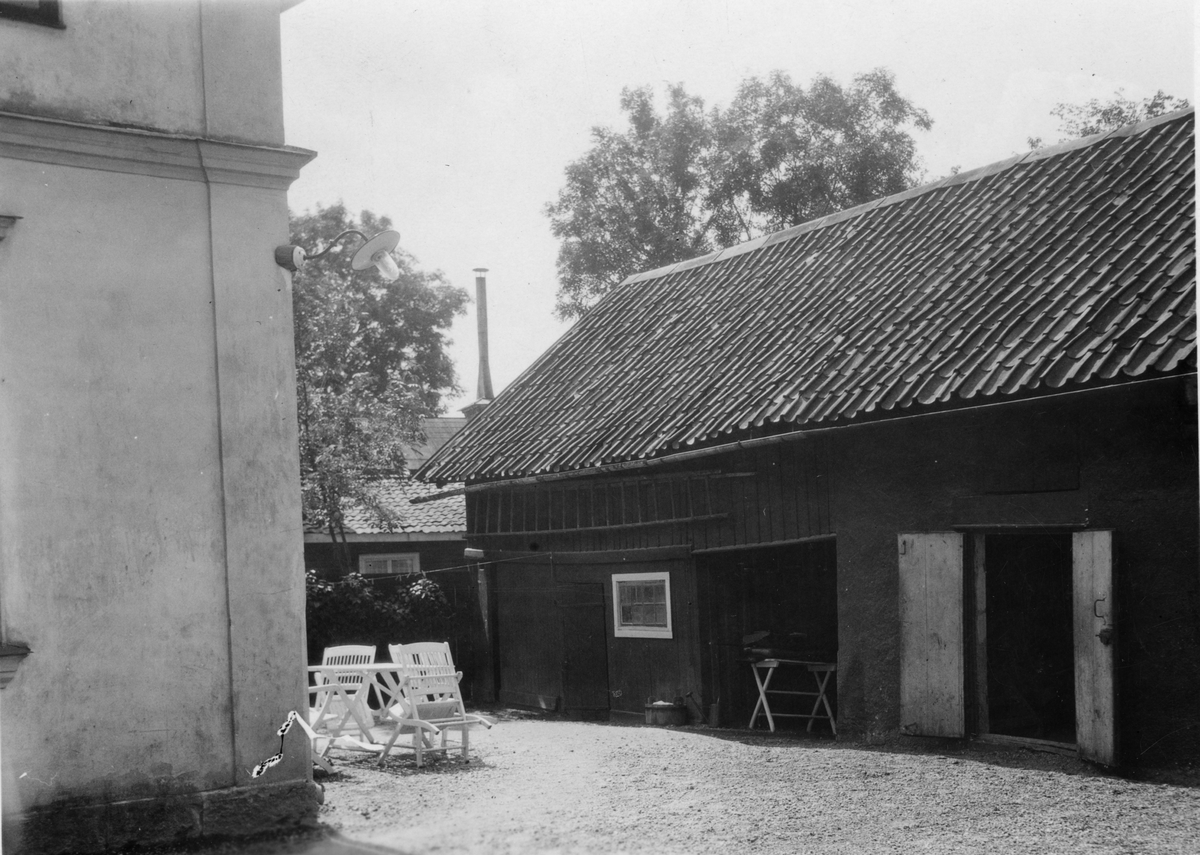 Trosa bryggeri. Svagdricksbryggeriet. Gårdsinteriör. Bryggeribyggnadens södra del till vänster samt portgången till ågatan.