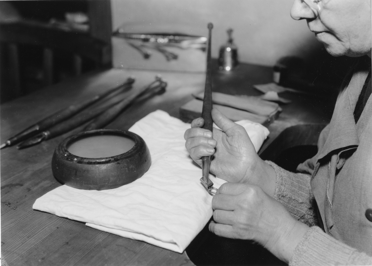 Hovjuvelerare K. Andersson i Stockholm. Polering av ring med polerstål.