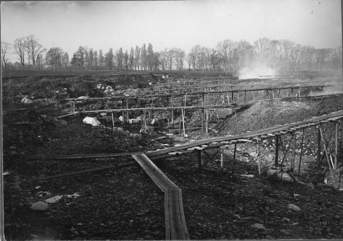 Kalugnar i verksamhet, kalkbrott och slagghögar. Hösten 1902 i Hönsäters Alunbruk. Med fotografiet erhöll fotografen 5:e pris i Svenska Turistföreningens Pristäflan 1902.