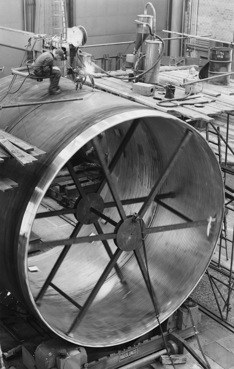 Reaktorkärl för Marviken får en innerdiameter av 5,2 meter och en höjd av 23 meter. Bilden visar sammansvetsningen med automat av två delar rill reaktortanken.