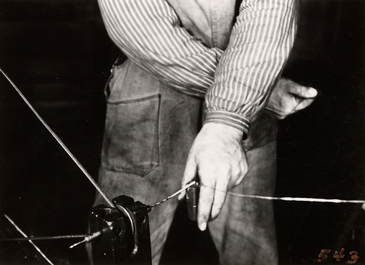 Knappnålstillverkning vid J.H. Tidbeck Metallduksväveri och Metalltrådsvarufabrik. Spinning av knappnålsknappar med spinnrock. Spiralen kallas "träns". Tråden som knapparna spinns på kallas "mole".