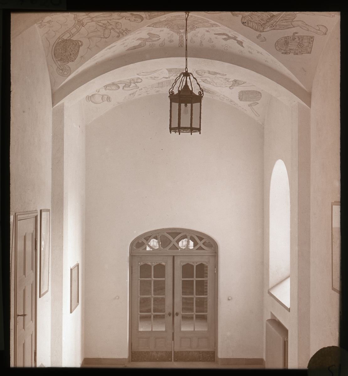 Skioptikonbild från institutionen för fotografi vid Kungliga Tekniska Högskolan. Använd av professor Helmer Bäckström som undervisningsmaterial. Bäckström var Sveriges förste professor i fotografi vid Kungliga Tekniska Högskolan 1948-1958. Trapphus. På bilden står skrivet: Indir. svaveltoning + guldtoning (överexp. underframk) För mer info: se Fotografisk Handbok av Helmer Bäckström. Natur och Kultur. Andra omarbetade upplagan 1958-59. Kap. 75-79 Toningsförfaranden för silverbilder (sid 585 och följande).