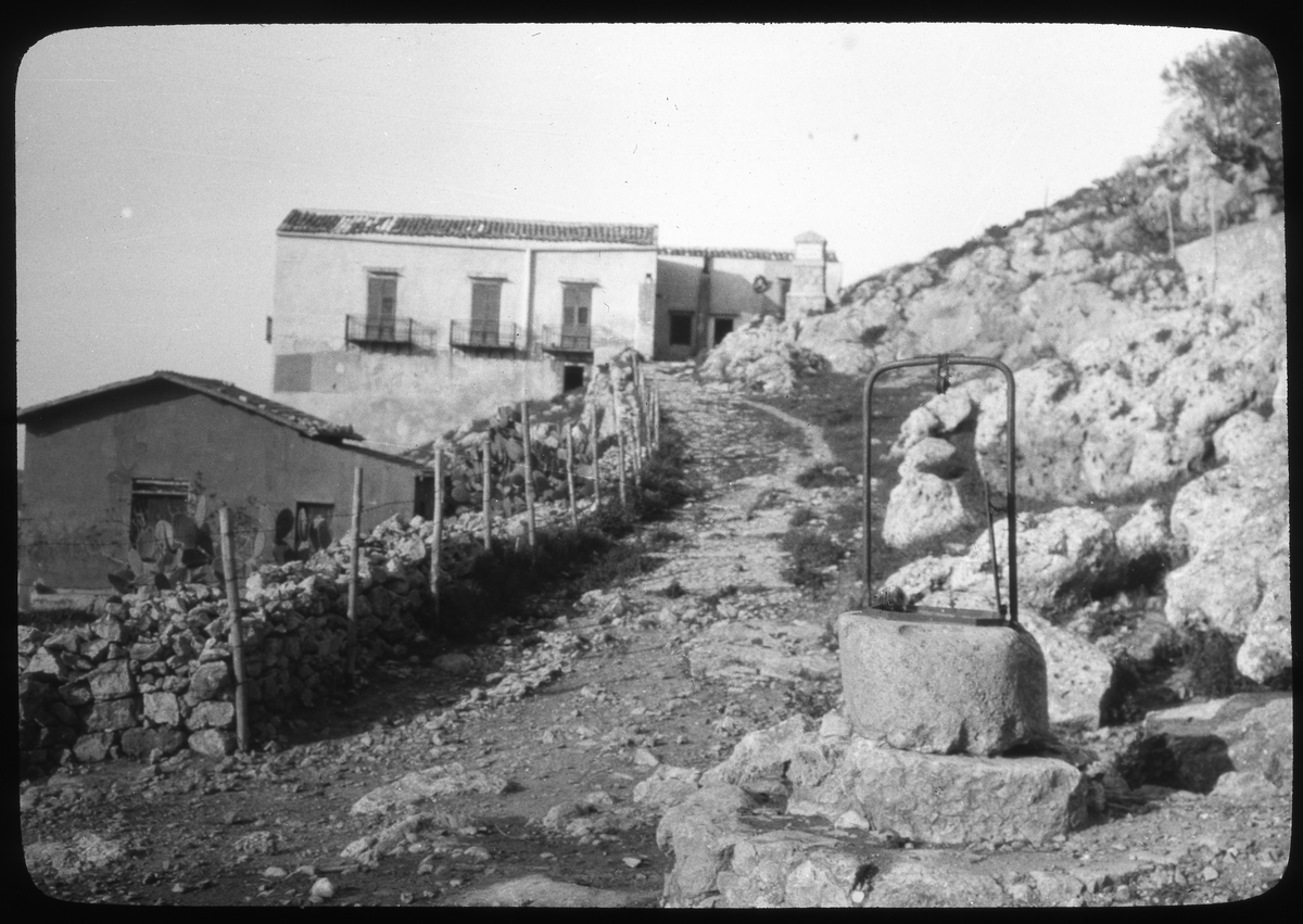 Skioptikonbild från institutionen för fotografi vid Kungliga Tekniska Högskolan. Bilden är troligen tagen av John Hertzberg under en resa i Europa. Hertzberg blev docent i fotografi 1921vid Kungliga Tekniska Högskolan i Stockholm. Hus med vattenbrunn.