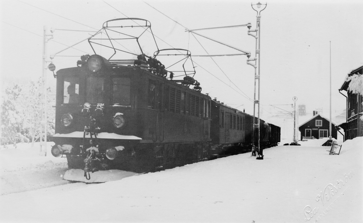 Malmtåg med elektriskt lokomotiv på banan Malmberget - Riksgränsen - Narvik.