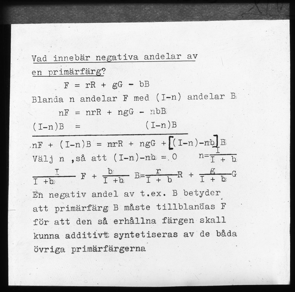 Skioptikonbild från institutionen för fotografi vid Kungliga Tekniska Högskolan. Använd av professor Helmer Bäckström som föreläsningsmaterial. Bäckström var Sveriges första professor i fotografi vid Kungliga Tekniska Högskolan 1948-58. Motiv föreställande "Vad innebär negativa andelar av en primärfärg?" (För mer text se bilden)