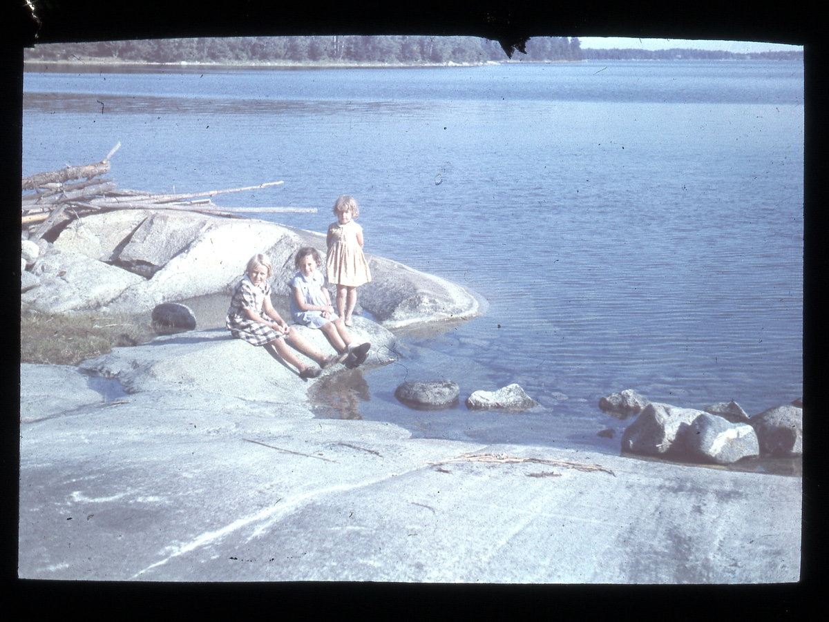 Diabild från institutionen för fotografi vid Kungliga Tekniska Högskolan. Använd av professor Helmer Bäckström som föreläsningsmaterial. Bäckström var Sveriges första professor i fotografi vid Kungliga Tekniska Högskolan 1948-58. Motiv föreställande "Barn på klippor".